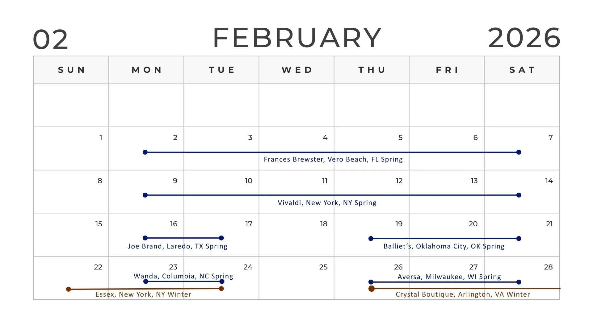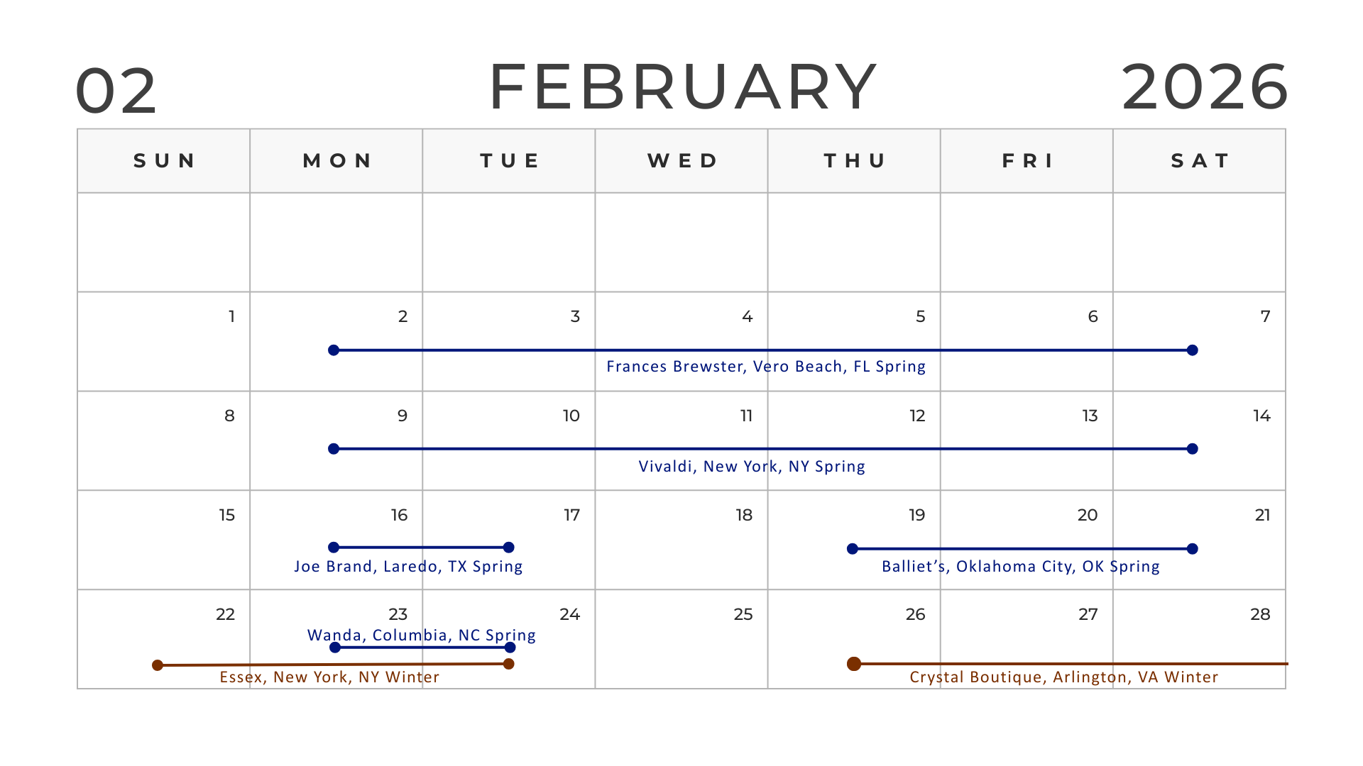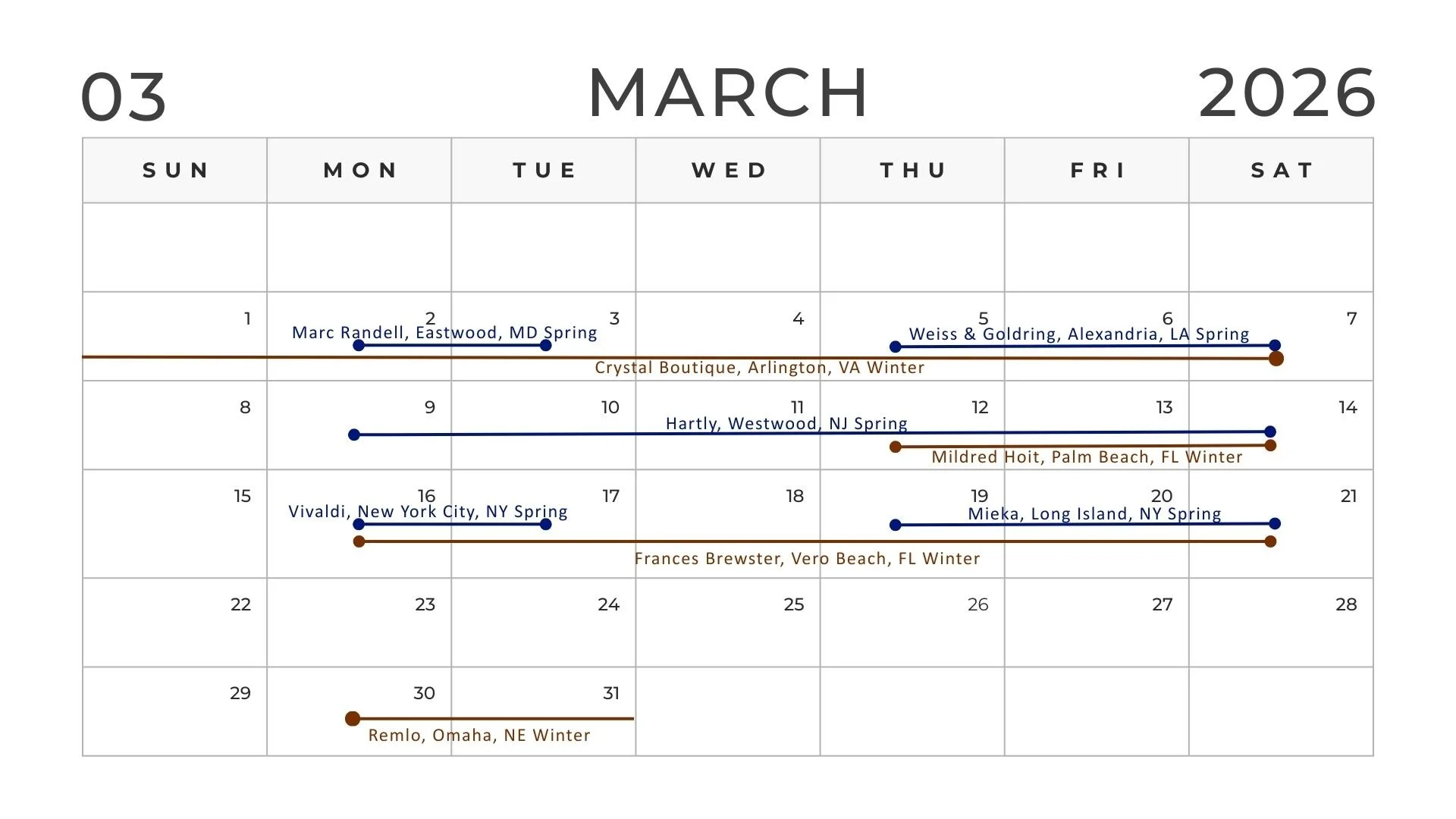 Locate a trunk show in your area and join us in person. At the trunk show you can view our samples and design your dream selections, all made to order, of course.