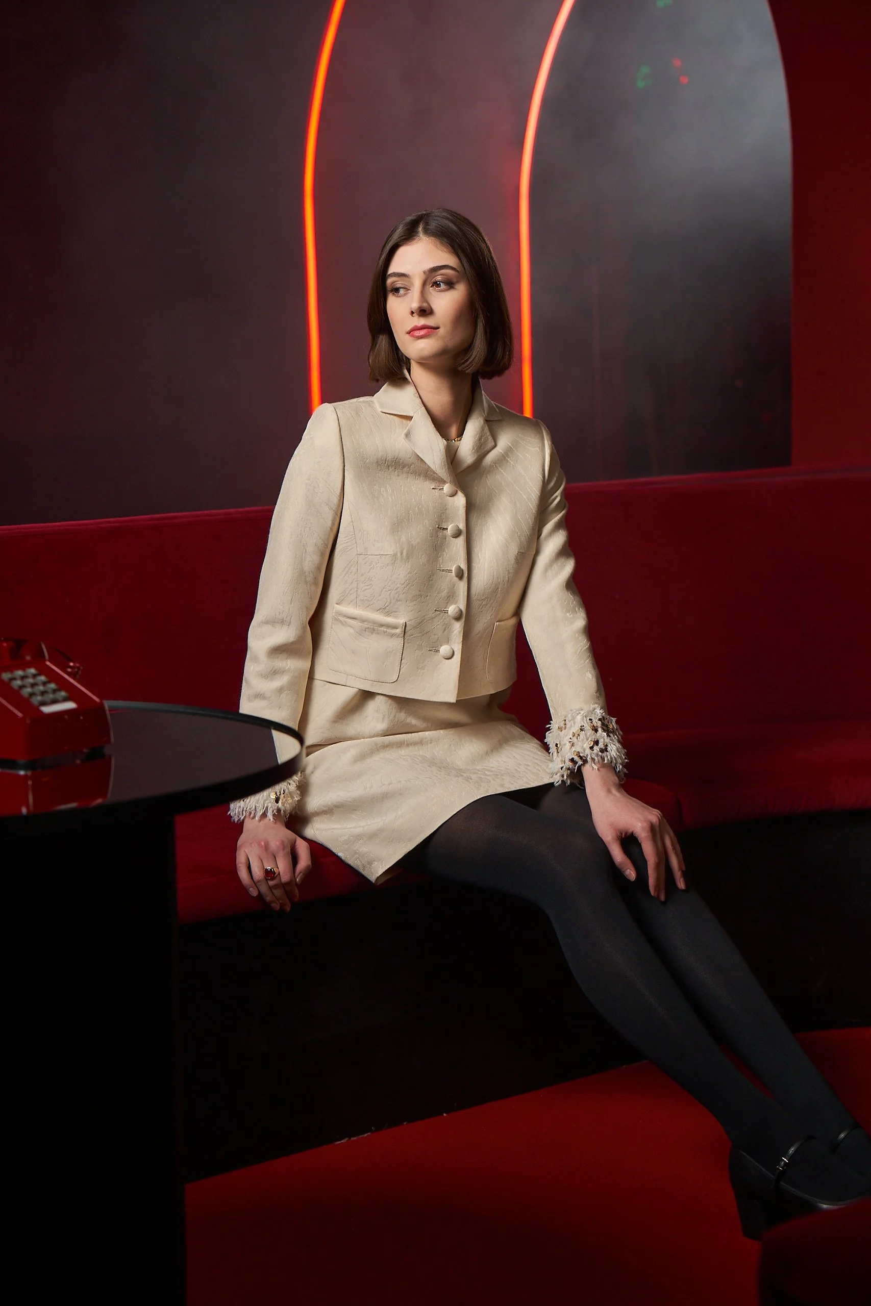Cashmere mockneck sweater in grey & cream with matched skirt