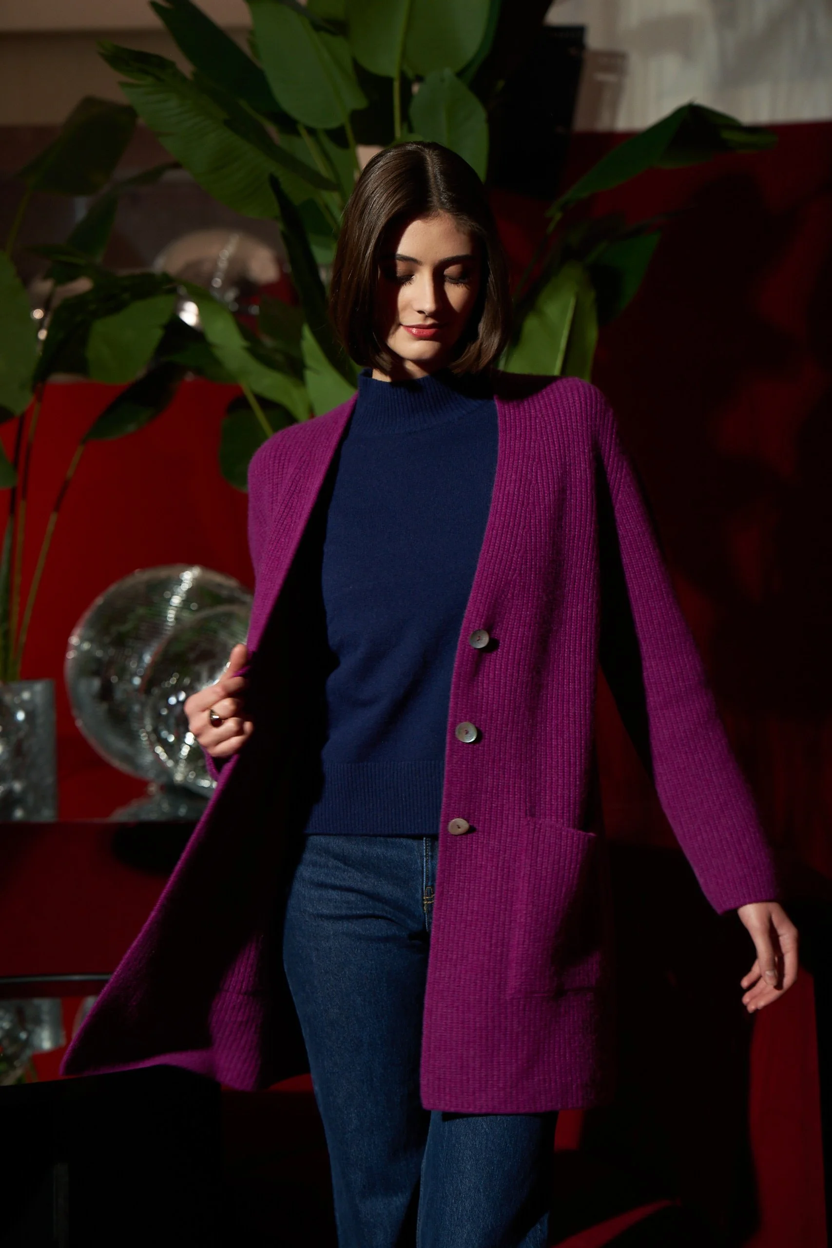 Fuchsia long cashmere jacket with navy mockneck sweater